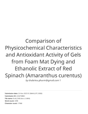 Ayu, Shabrina (2026) Comparison of Physicochemical Characteristics and Antioxidant Activity of Gels from Foam Mat Dying and Ethanolic Extract of Red Spinach (Amaranthus curentus). universitas wahid hasyim.